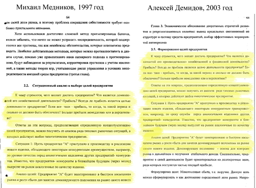 Кое-где демидовский и медниковский труды неотличимы. Где-то будущий ректор, наоборот, предпочитает короткую хэмингуэевскую фразу длинным толстовским высказываниям предшественника. Слово «конечно» меняет на «разумеется», «1 рубль» – на «один рубль». Что не меняет результат: около двадцати страниц у Демидова кажутся родными и близкими тому, что было защищено за шесть лет до него.