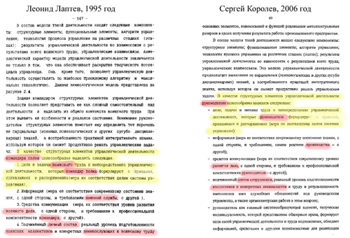 Произведение Королева, судя по «Антиплагиату», демонстрирует связи с докторской диссертацией военного психолога Леонида Лаптева за 1995 год. Внимательный читатель найдет пятистраничный фрагмент, где оба мужа рассуждают о достоинствах руководителя: Королев – промышленного предприятия, Лаптев – «командира ракетного полка». Вот и вся разница. Добродетели, как оказалось, можно описать абсолютно одинаковыми абзацами и предложениями. Хотя, конечно, «Фонтанка» не смеет предположить, что Королев писал не самостоятельно. Иначе как объяснить, что «требования военной службы» в диссертации Лаптева превращаются в «реалии производства», «воинский труд» – в «труд на порученном участке», а «поддержание боеготовности» – в «производственные задачи»?