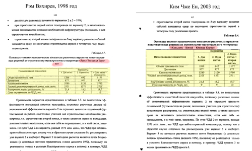 Но истинных друзей науки должен привлечь фрагмент на страницах 115 – 120 кимовского труда. Аспирант ломает голову над «применением опционов» при строительстве газопровода «Ковыкта – Китай – Южная Корея» (сейчас он больше известен как проект «Сила Сибири» и, согласно заявлениям, должен принести «Газпрому» 400 миллиардов долларов от Китая. – Прим. ред.). Пассажи Кима чудесным образом совпадают с мнением Вяхирева… о газопроводе «Ямал – Западная Европа». Трубы, оказывается, и инвестиций потребуют одинаковых, и окупятся за одно и то же время, и предназначены для поставок одного и того же объема газа.