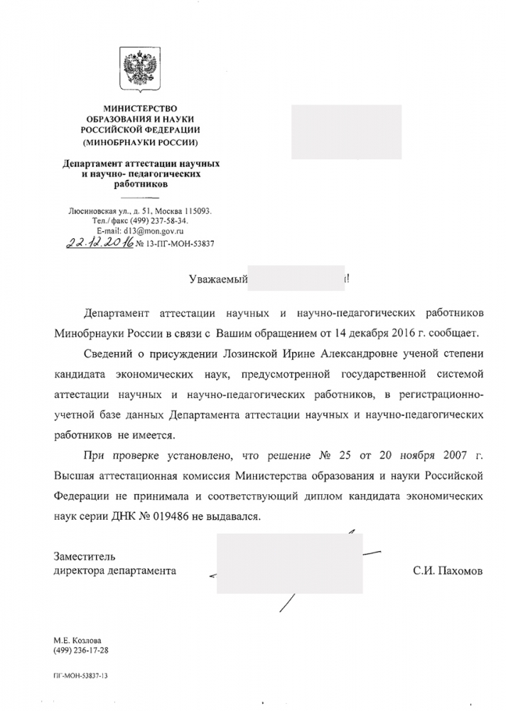 Департамент аттестации научных и научно-педагогических работников Минобрнауки РФ не располагает сведениями о присуждении Ирине Александровне Лозинской ученой степени кандидата экономических наук.