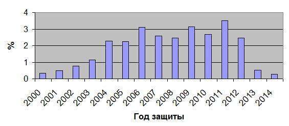 Посмотрите на это чудо статистики. Что на графике? Распределение процентного отношения масштабно сплагиаченных диссертаций (по данным Диссернета) к полному числу защищенных диссертаций в зависимости от года защиты.