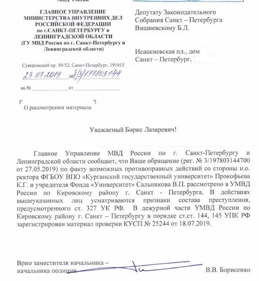 Полиция Санкт-Петербурга заподозрила в действиях бывшего и. о. ректора Курганского государственного университета Константина Прокофьева и учредителя питерского фонда «Университет» генерала милиции Виктора Сальникова признаки преступления, предусмотренного статьей 327 УК РФ («Подделка документов»). Об этом говорится в письме за подписью врио замначальника ГУ МВД РФ по Санкт-Петербургу и Ленинградской области — начальника полиции Виктора Борисенко, направленного депутату Заксобрания Санкт-Петербурга Борису Вишневскому в ответ на его запросы в прокуратуру и Следственный комитет РФ.