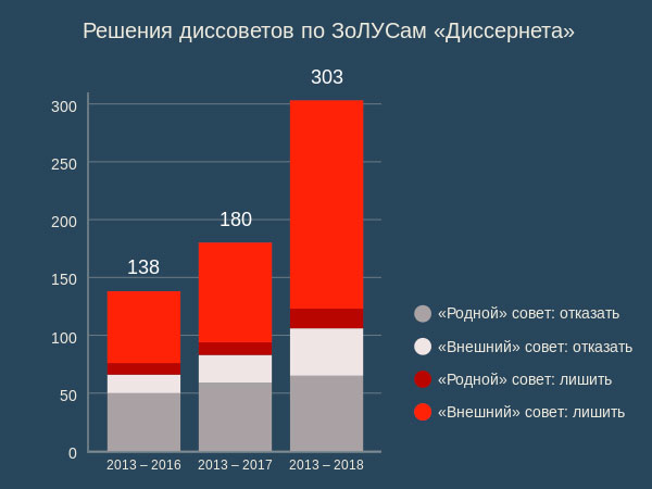 В 2018 году отдел жалоб «Диссернета» подал в Минобрнауки России 119 заявлений о лишении ученых степеней, не считая повторных обращений. 63 человека лишились "корочек" благодаря стараниям «Диссернета». Решения (накопленным итогом) "родных" и "внешних" диссертационных советов по ЗоЛУСам «Диссернета» за годы нашей работы на картинке ниже.